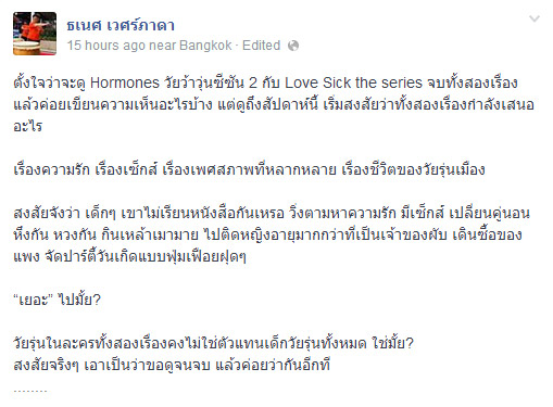 "ตั้งใจว่าจะดู Hormones วัยว้าวุ่นซีซั่น 2 กับ Love Sick the series จบทั้งสองเรื่อง แล้วค่อยเขียนความเห็นอะไรบ้าง แต่ดูถึงสัปดาห์นี้ เริ่มสงสัยว่าทั้งสองเรื่องกำลังเสนออะไร เรื่องความรัก เรื่องเซ็กส์ เรื่องเพศสภาพที่หลากหลาย เรื่องชีวิตของวัยรุ่นเมือง