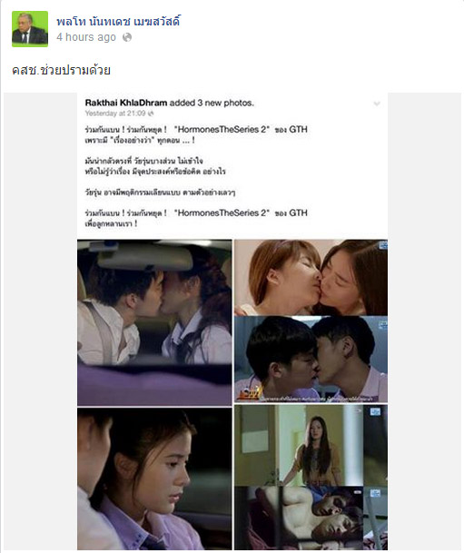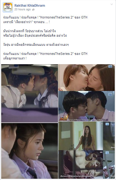 ในขณะที่เพจรักไทย กล้าธรรม Rakthai KhlaDhram   ก็ได้โพสต์ฉากจูบและฉากล่อแหลมจากซีรีส์ พร้อมแสดงข้อเรียกร้องให้ช่วยกันแบนซีรีส์ฮอร์โมน 2 โดยบอกว่า ซีรีส์เรื่องนี้มีเรื่องอย่างว่าทุกตอน "มันน่ากลัวตรงที่ วัยรุ่นบางส่วนไม่เข้าใจ หรือไม่รู้ว่าเรื่องมีจุดประสงค์หรือข้อคิดอย่างไร วัยรุ่นอาจมีพฤติกรรมเลียนแบบตามตัวอย่างเลว ๆ"